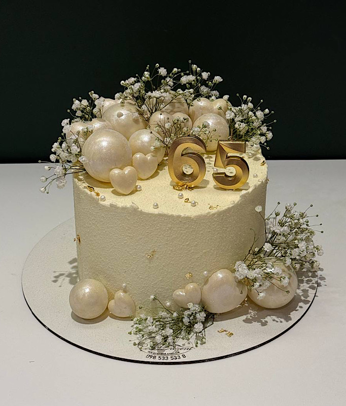 Святковий торт на 65 років з елегантним білим шоковелюром, ніжною гіпсофілою та перламутровими кульками — ідеальний вибір для ювілею. Оксамитова текстура покриття створює розкішний вигляд, а об’ємні цифри 65 підкреслюють важливість події та роблять торт центральною прикрасою святкового столу. Ми виготовляємо ювілейні торти на замовлення з урахуванням ваших побажань: підбираємо начинку, вагу та декор відповідно до стилю свята. Доступні класичні, ягідні та шоколадні смаки.