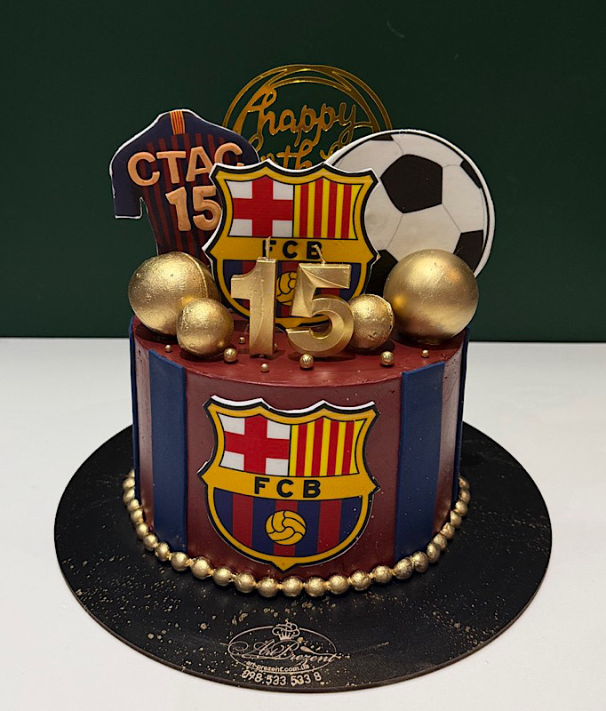 Цей яскравий та святковий торт створений для справжніх шанувальників футбольного клубу Барселона. Покритий у традиційних кольорах клубу — синьому та бордовому, він прикрашений футбольним м’ячем, міні-трофеями та емблемою команди. Золоті акценти додають святкового шарму, а елементи у вигляді футболки, футбольного мʼяча роблять торт максимально тематичним та реалістичним. Ідеальний подарунок на день народження, спортивні досягнення чи будь-яке футбольне свято.