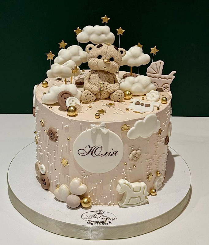 Шукаєте ідеальний торт на день народження малюка або на хрестини? Ніжний торт з ведмедиком, повітряними хмарками та золотими зірочками стане справжньою окрасою святкового столу. Дизайн виконаний у пастельних відтінках, що створює атмосферу затишку, тепла та казки. Фігурка милого ведмедика гармонійно поєднується з об’ємними хмарками та сяючими зірочками, створюючи казкову композицію для фотосесії та незабутніх моментів. Ми пропонуємо індивідуальне оформлення, можливість додати ім’я дитини, цифру віку та підібрати улюблений смак начинки. Торт виготовляється з натуральних інгредієнтів та з любов’ю до деталей. Замовляйте торт з ведмедиком, хмарками і зірочками – подаруйте своїй дитині солодку казку!