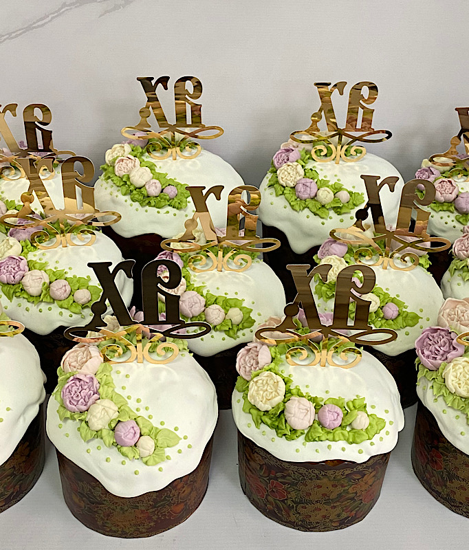 Великодня паска з ніжного здобного тіста з цедрою цитрусових, цукатами та родзинками. Вкрита білою глазур’ю та прикрашена шоколадними квітами у бузкових, рожевих і білих тонах із зеленими листочками. Завершує декор елегантний золотий топер «ХВ». Ніжна, весняна та дуже витончена — справжня окраса великоднього столу.